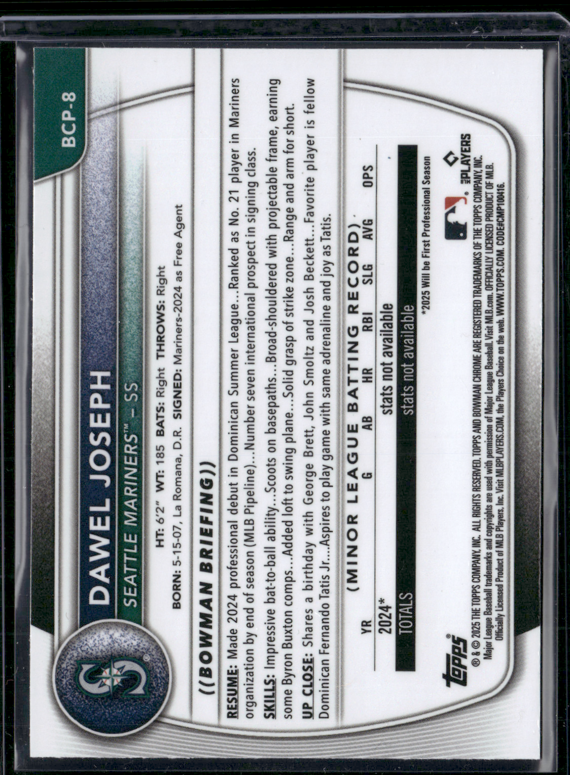 📌 2025 Bowman DAWEL JOSEPH #BCP-8 Reptilian Chrome 🔥 Get your hands on this rare and highly sought-after DAWEL JOSEPH card from 2025 Bowman! ✨ Card Details: Set: 2025 Bowman Card Number: #BCP-8 Player: DAWEL JOSEPH Condition: RAW Parallel/Insert: Reptilian Chrome 📦 Shipping and Handling: ✅ Ships in a penny sleeve + top loader for maximum protection ✅Shipped within 24 hours of payment ✅Combined shipping available for multiple orders 💯 Why Buy From Us? ⭐ Trusted Seller with Fast and Secure Shipping ⭐All cards are handled with care and packaged securely ⭐Satisfaction Guaranteed — See Our Feedback! 👉 Check out our store for more rookie cards, autographs, and inserts! 👉Follow us for new listings and special offers! Thank you for shopping at Yacono Sports Collectibles!🔥 Listed With Mascot.