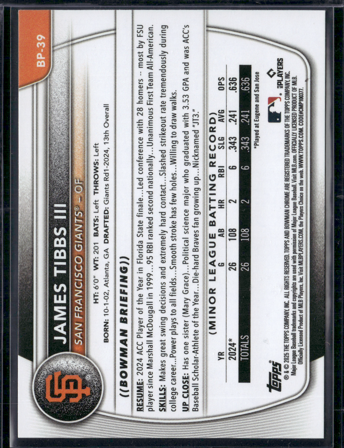 📌 2025 Bowman JAMES TIBBS III #BP-39 🔥 Get your hands on this rare and highly sought-after JAMES TIBBS III card from 2025 Bowman! ✨ Card Details: Set: 2025 Bowman Card Number: #BP-39] Player: JAMES TIBBS III Condition: RAW 📦 Shipping and Handling: ✅ Ships in a penny sleeve + top loader for maximum protection ✅Shipped within 24 hours of payment ✅Combined shipping available for multiple orders 💯 Why Buy From Us? ⭐ Trusted Seller with Fast and Secure Shipping ⭐All cards are handled with care and packaged securely ⭐Satisfaction Guaranteed — See Our Feedback! 👉 Check out our store for more rookie cards, autographs, and inserts! 👉Follow us for new listings and special offers! Thank you for shopping at Yacono Sports Collectibles!🔥 Listed With Mascot.